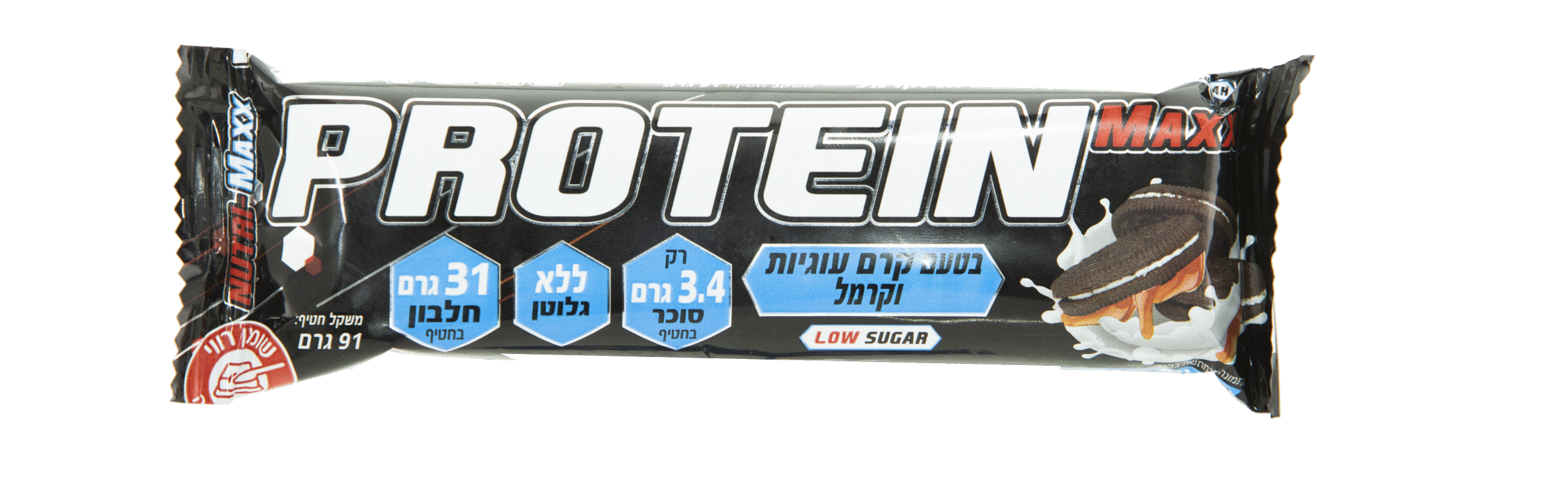 חטיף חלבון- פרוטאין מקס עוגיות קרמל- 91 גרם נמכר במארז של 12 יחידות בלבד. חטיפי חלבון, המכונים גם חטיפי אנרגיה, מהווים מקור זמין לחלבון איכותי בריכוז גבוהה, ומתאימים לאלו אשר תזונתם היומית איננה מכילה כמות חלבון מספקת, כגון צמחונים, טבעונים ואלו העוסקים בספורט או עבודה פיזית מאומצת.